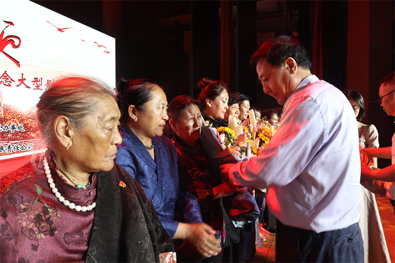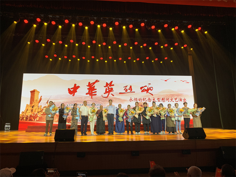 演出前,中華英烈褒揚事業促進會會長李中水和陽光藝術團團長王福方,向出席慰問演出的阮國琴(“海空衛士”王偉烈士妻子)、卓英(青海省玉樹藏族自治州三江源頭“玉樹雄鷹”寧瑪才仁烈士母親)等15位烈士親屬代表獻上鮮花,表達了對他們的崇高敬意。