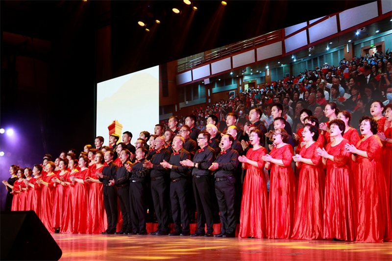大合唱《我把太陽迎進祖國》,氣勢恢宏,歌聲嘹亮。混聲小合唱《日月同光》、女聲小合唱 《微山湖》、男聲五重唱《彈起我心愛的土琵琶》、小合唱《我和我的祖國》,男女聲二重唱《領航》,歌聲委婉,情深意長。告訴我們,無論時間多么漫長,中國共產黨都在我們身旁,相依相戀,為我們指引方向。江山就是人民,匯成胸中景象,為了千秋偉業,為了時代華章,前赴后繼,鑄就輝煌,偉大的中國共產黨,風華正茂,山高水長,昂首挺立在新時代的征程上。