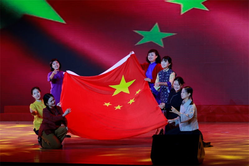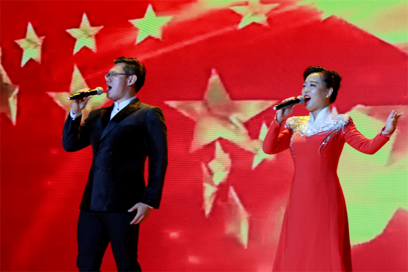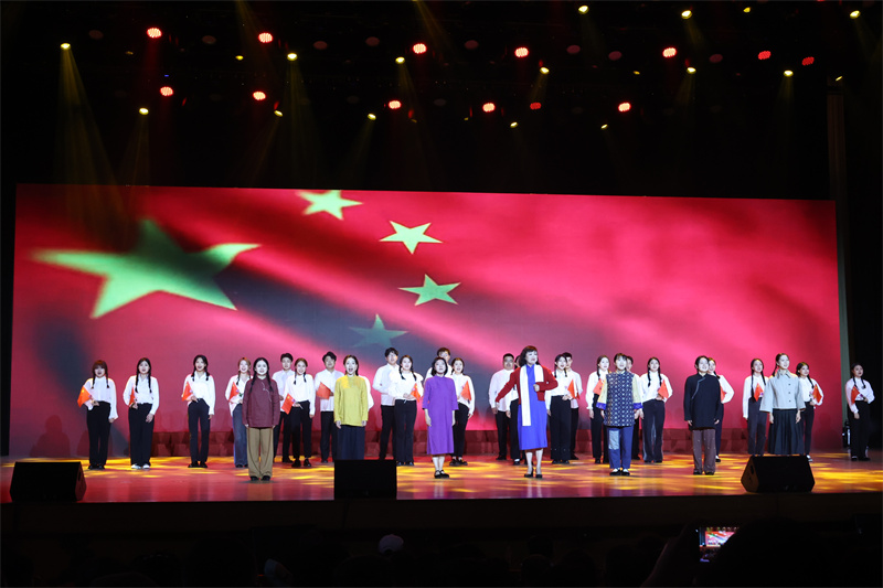 演出結束,全場觀眾起立,齊唱《歌唱祖國》,臺上臺下揮舞著國旗,歌聲產生了共鳴,在禮堂中回蕩,很多人流下熱淚。