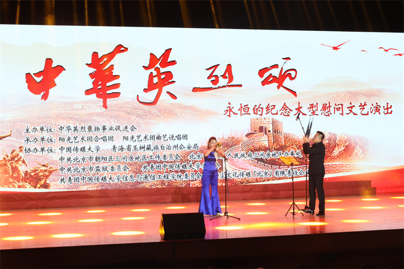 誓志忠貞為國家,滿腔熱血沃中華。在2023年第十個國家烈士紀念日前夕,為緬懷革命先烈,弘揚英烈精神,9月24日,由中華英烈褒揚事業促進會主辦,陽光藝術團合唱團、曲藝說唱團承辦,中國傳媒大學、朝陽區三間房地區工作委員會、青海省玉樹藏族自治州警察協會、北京市監獄委員會協辦的“中華英烈頌·永恒的紀念”大型慰問文藝演出在中國傳媒大學舉行。