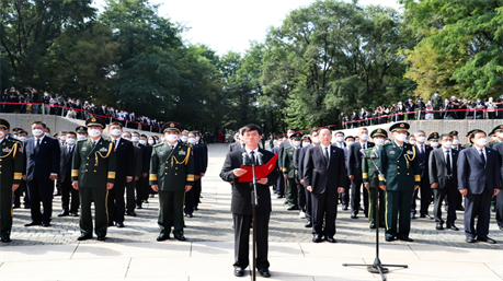 9月17日上午,第九批在韓中國人民志愿軍烈士遺骸安葬儀式,在沈陽抗美援朝烈士陵園舉行,退役軍人事務(wù)部黨組書記、部長(zhǎng)裴金佳出席儀式并致祭文。